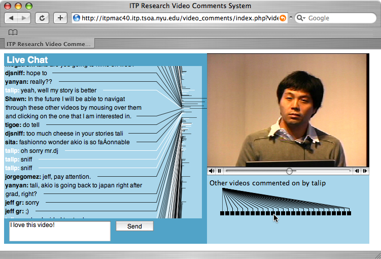 This project was presented as part of the Open Media Developers Summit in October, 2005 at ITP. We intend to continue developing “Video Comments” in conjunction with documenting the live stream, transcripts, chat archive, and interviews